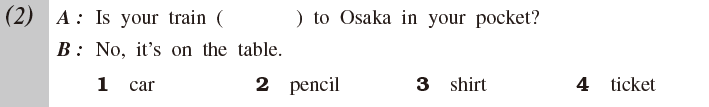ここでは()の前に電車。()の後に大阪と続き、Bが「いいえ、テーブルの上です」と応えているので、文脈から「4 ticket(切符)」が答えになります。