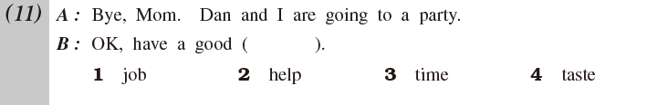 出かける人に声をかけるときのあいさつの表現の1つに「have a good time =「たのしんでね」「よい時間をすごしてね」があるので、ここの答えは「3 time」になります。