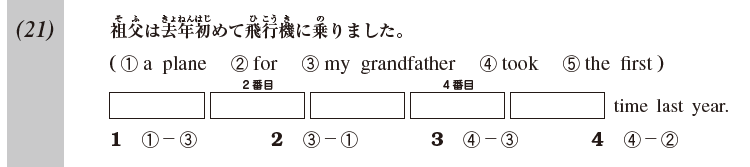 日本文の意味が通るように単語を並び替えて、2番目と4番目に来るものの適切な組み合わせを選択します。