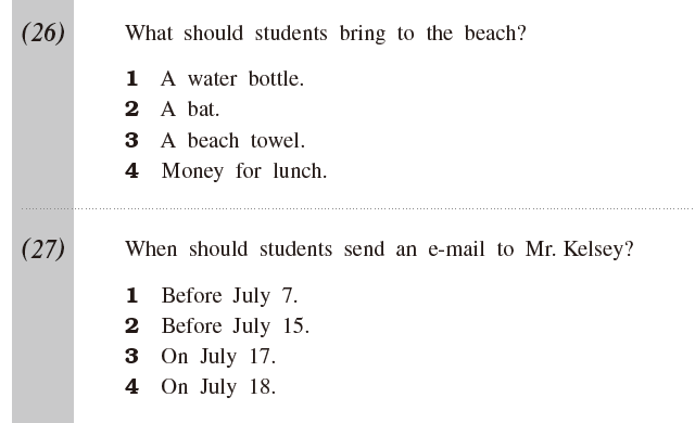 問題26では、「What should students bring to the beach?(生徒は何をビーチに持っていくべきですか?)」と尋ねています。